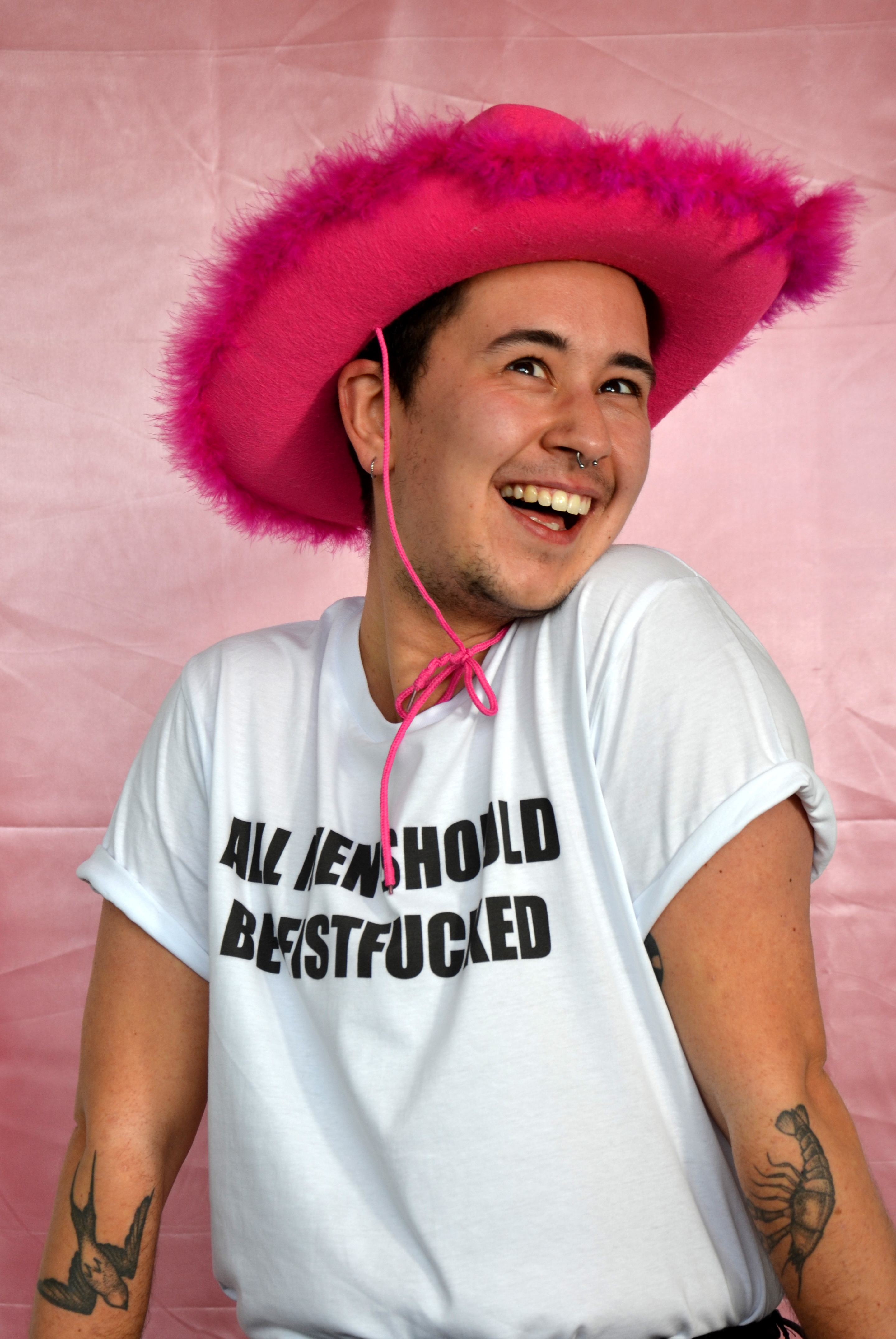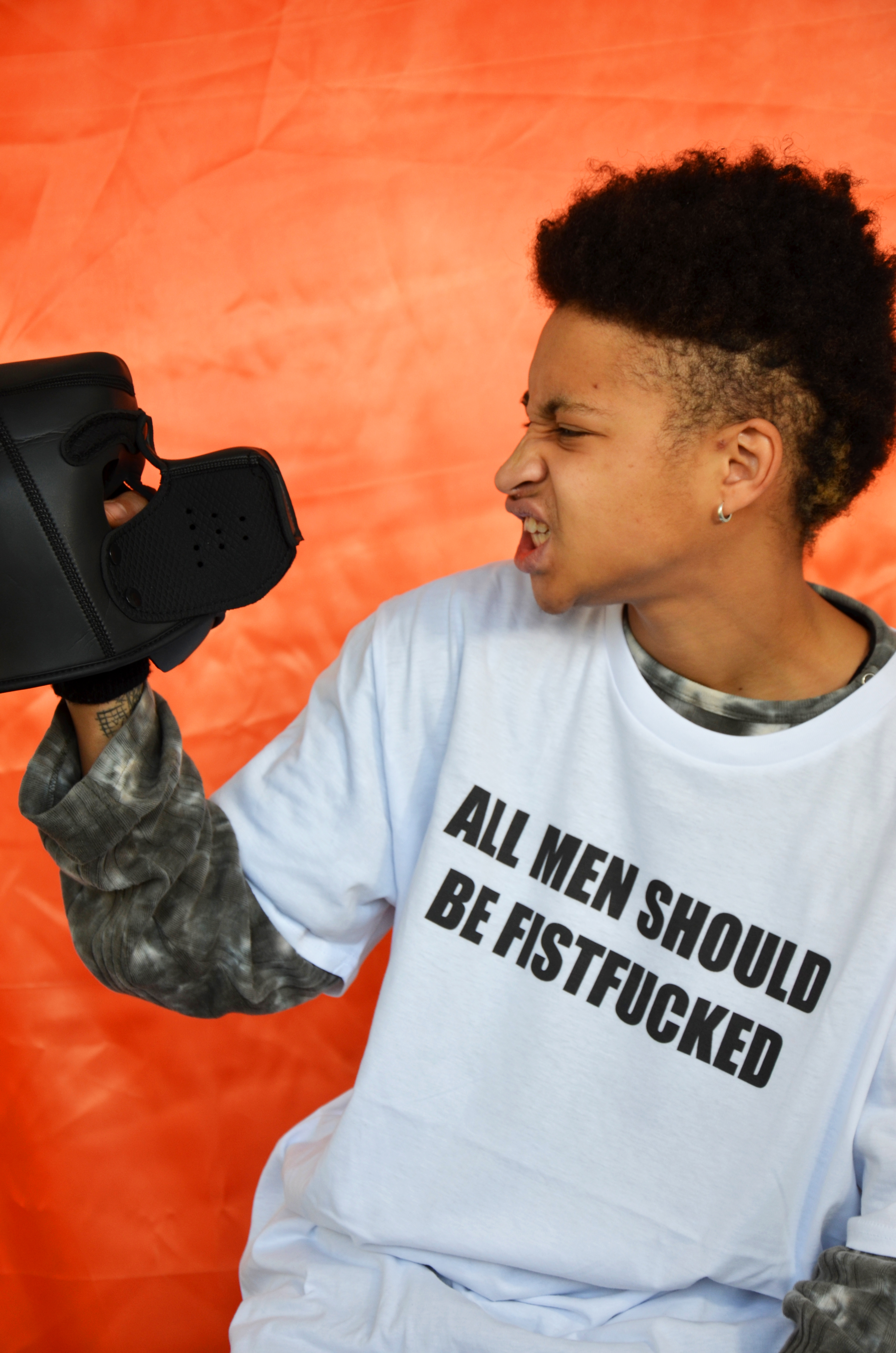 Photos pour la promotion et la diffusion des tee-shirts de l’artisteL. Camus Govoroff, “all men should be fistfucked”, en novembre 2022.